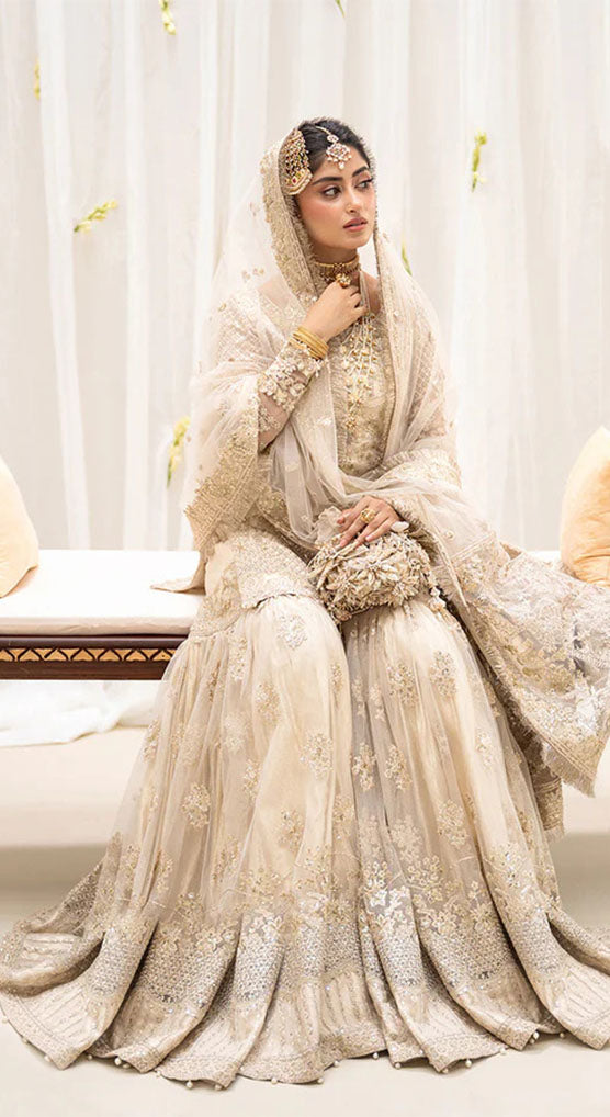 Modern yet steeped in tradition, Safak captivates with its graceful proportions and textural depth. Crafted on delicate ivory net canvas, the embroidered shirt features decadent gold adornments. The sheer overlay flows gently over an embroidered net gharara, creating a silhouette...