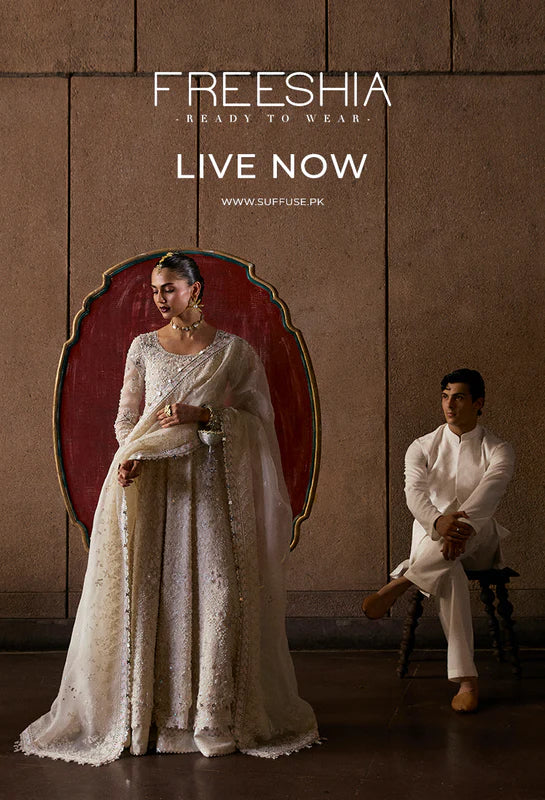 A perfect embodiment of celebration, ‘Sehr’ a graceful ensemble, featuring the timeless charm of dusty mauve. This lavishly adorned Organza Jacket and airy drape dupatta with enchanting screen print, is skillfully adorned with intricate hand embellishments work, pairied with a Crushed...