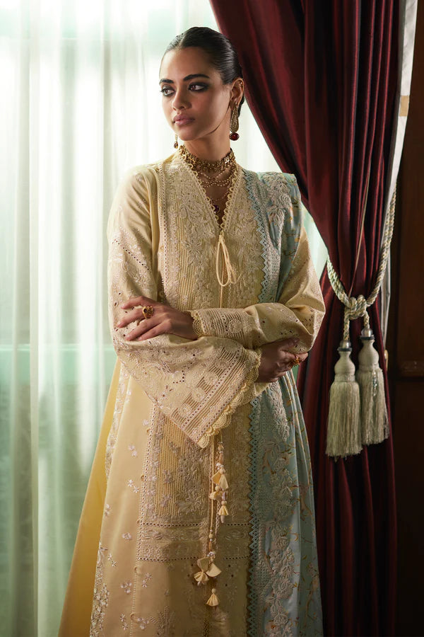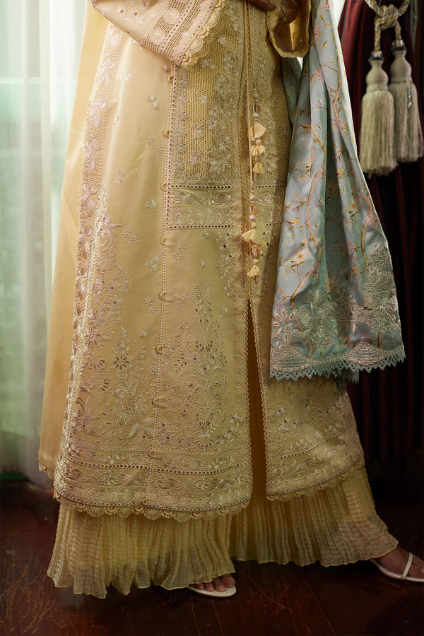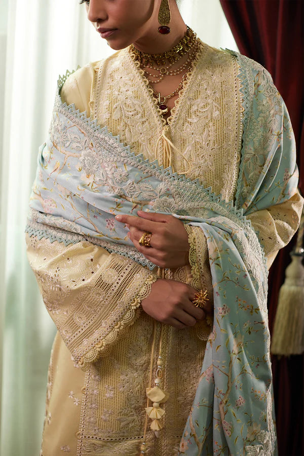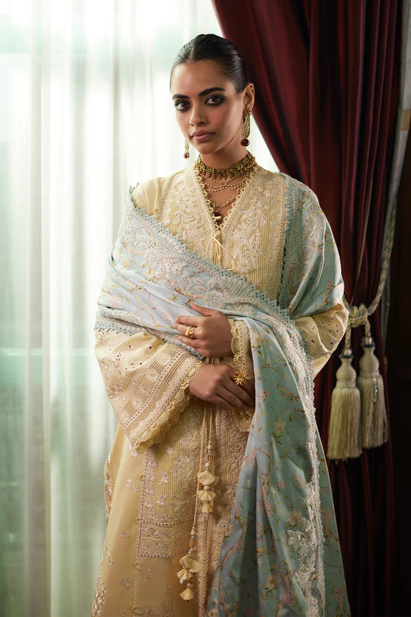 Introducing a charming butter yellow front-open shirt with beautiful off-white all-over embroidery. It comes with a silk contrast dupatta in ice blue, beautifully printed and embroidered, adding elegance to this stylish ensemble. Perfect for any special occasion.