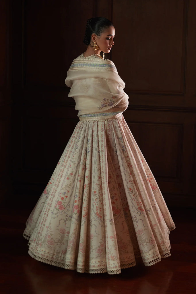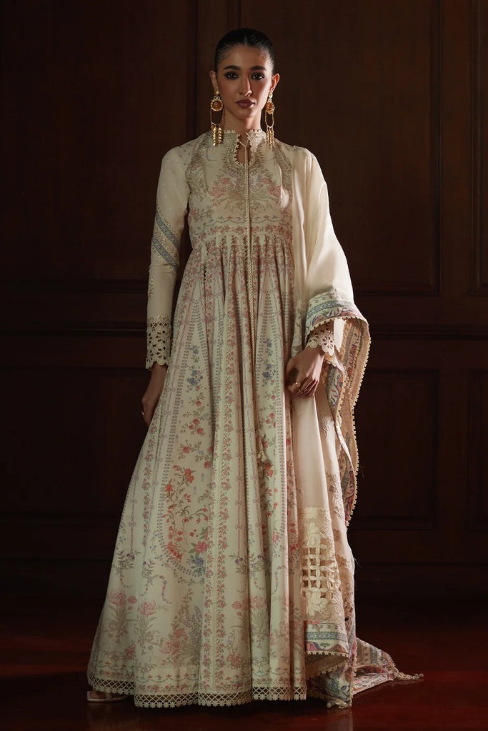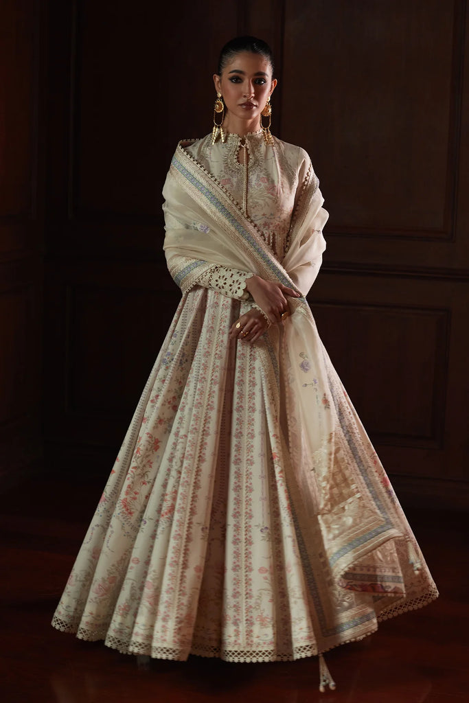 Introducing a stunning printed pishwas, perfect for Eid celebrations. This elegant frock features intricate floral prints and delicate embroidery, along with a generous flare for a beautiful silhouette. It comes with an embroidered organza dupatta and stylish azhar pants, making it an ideal choice for a graceful and festive look.