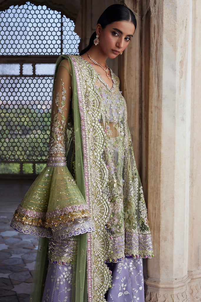 Turn heads this wedding season with Mehré-Lilac — a citrus green organza bodice shimmering with silver sequins, pearls, and cut dana, paired with a lilac and royal amethyst lehenga adorned with metallic threadwork and floral jaal motifs.