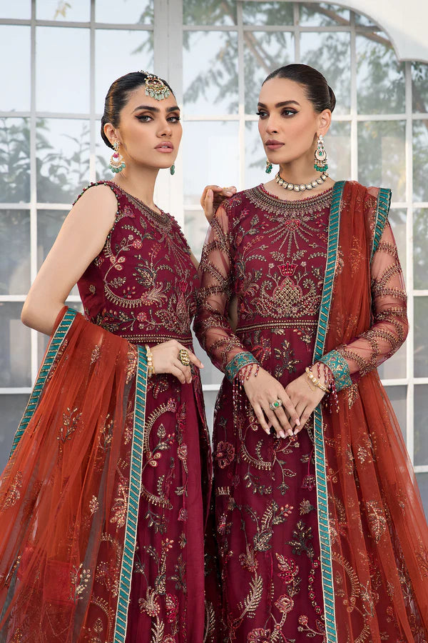 Rendered in a maroon shade, this ensemble features a net canvas gracefully adorned in multi-hued embroideries. It comes with a contrasting dupatta in orange giving it an eye catchy appeal.
